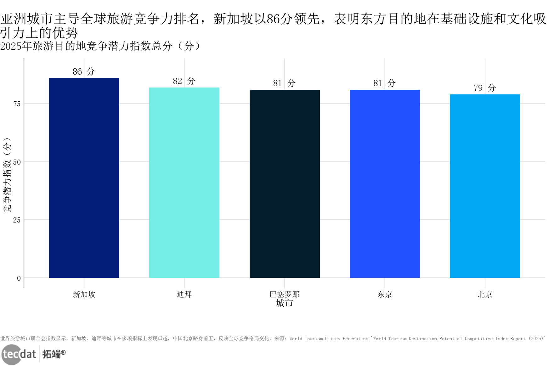 全球旅游趋势桑基图表11数据EXCEL及图表PDF模板已分享到会员群 3秒解读:全球旅游业从疫情冲击中快速复苏,长期增长趋势明确,AI将成为支撑行业规模化发展的核心基础设施。 对应人群行动建议:跨国文旅企业可布局全球AI数据平台,投资者可关注AI旅游服务商的长期价值。 全球旅游目的地的竞争力格局中,亚洲城市占据主导地位,智慧化建设与AI技术的深度融合,成为提升目的地竞争力的核心加分项。2025年旅游目的地竞争潜力指数排名中,新加坡以86分稳居第一,迪拜82分、东京81分、巴塞罗那81分并列第二,北京以79分跻身前五。这些核心城市均已实现AI技术的深度落地,新加坡的智能通关系统、东京的AI个性化行程推荐、北京的智慧景区管理,不仅显著提升了游客的体验感,也为全球文旅目的地的智慧化建设树立了标杆。