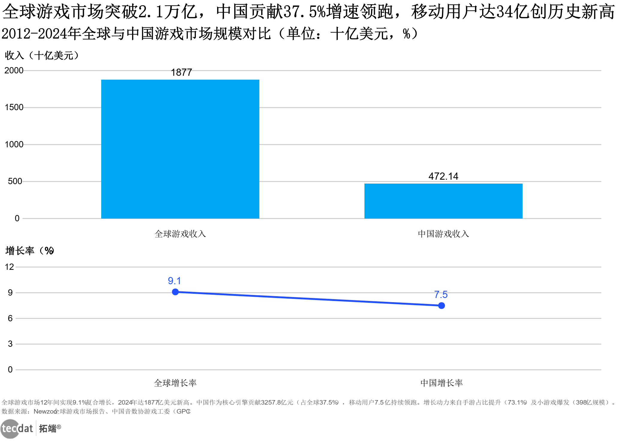 2024年全球游戏市场创下1877亿美元新高,复合增长率达9.1%。中国市场贡献3257.8亿元收入,移动游戏占比73.1%成为核心支柱。区域市场呈现鲜明分化:
