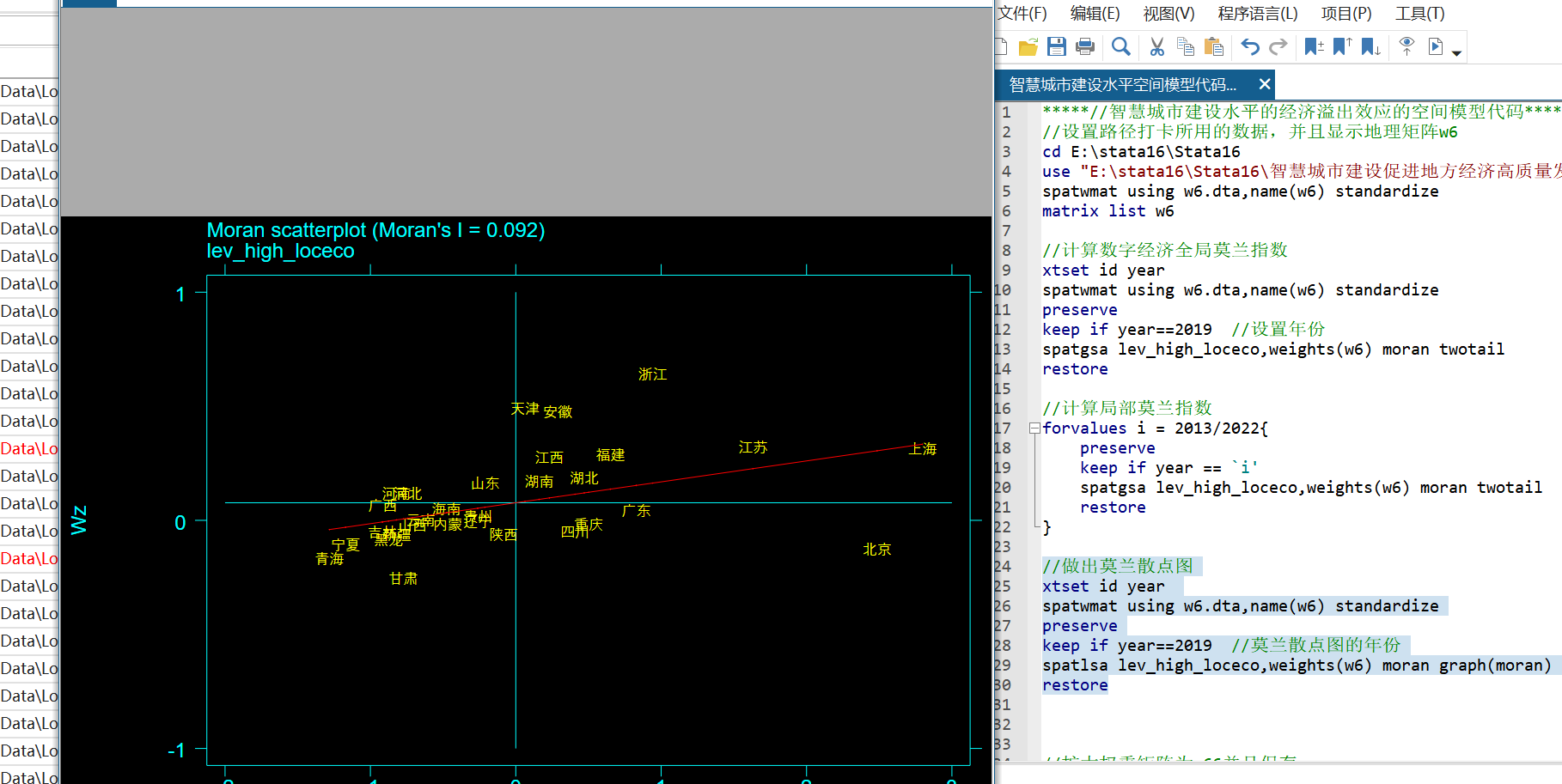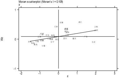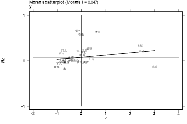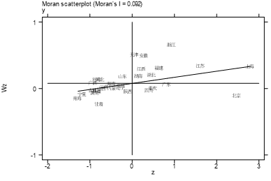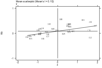 散点图中多数点分布于第一、三象限,呈现“高-高”“低-低”聚集模式,进一步验证空间正相关。