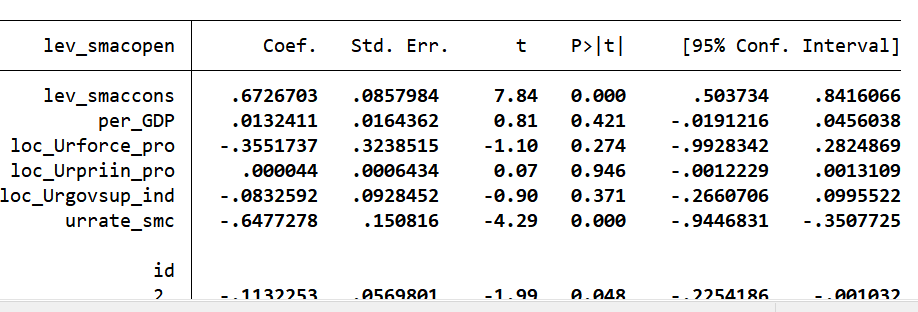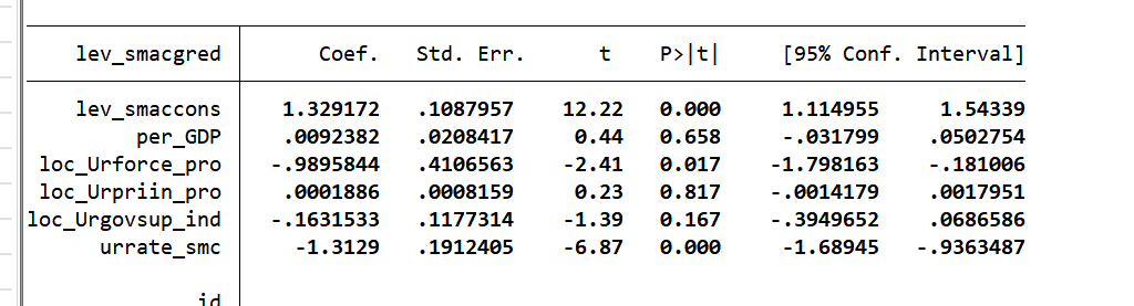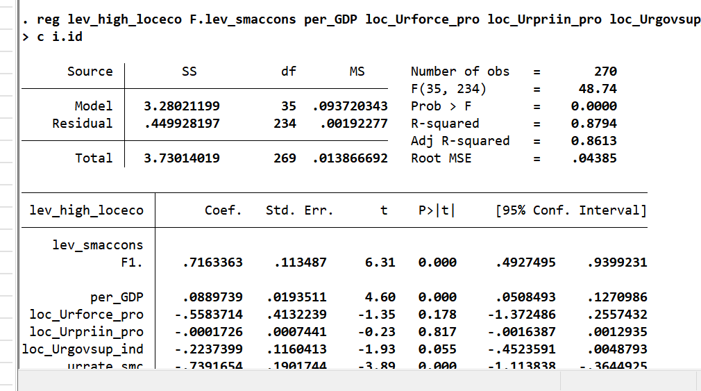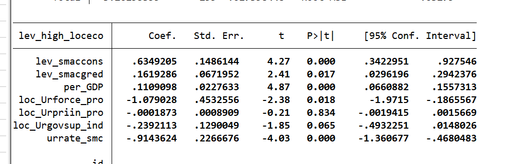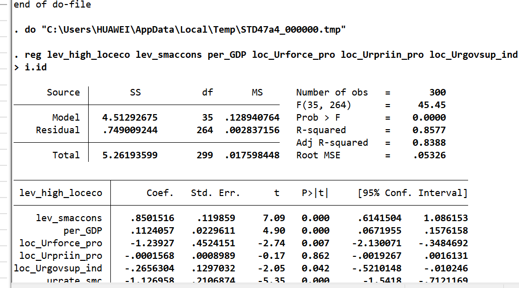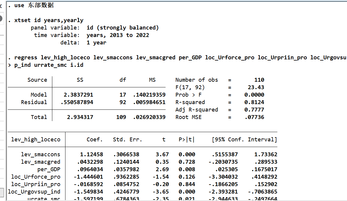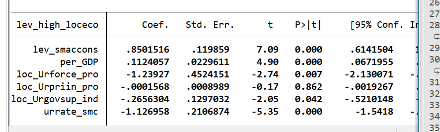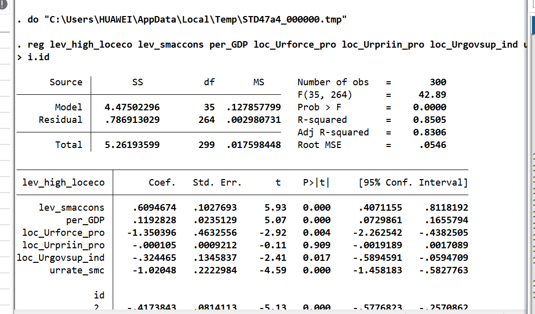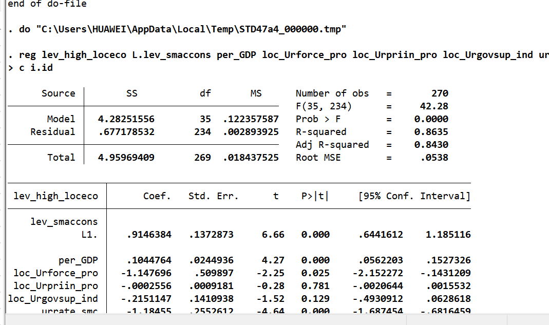 为验证H1,设定固定效应模型如下: lev_high_loceco(it) = α0 + α1lev_smaccons(it) + α2control(it) + μi + vt + ε(it)