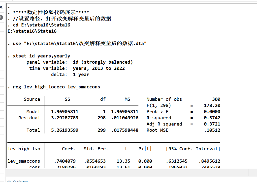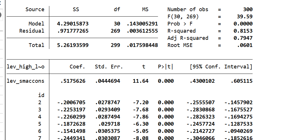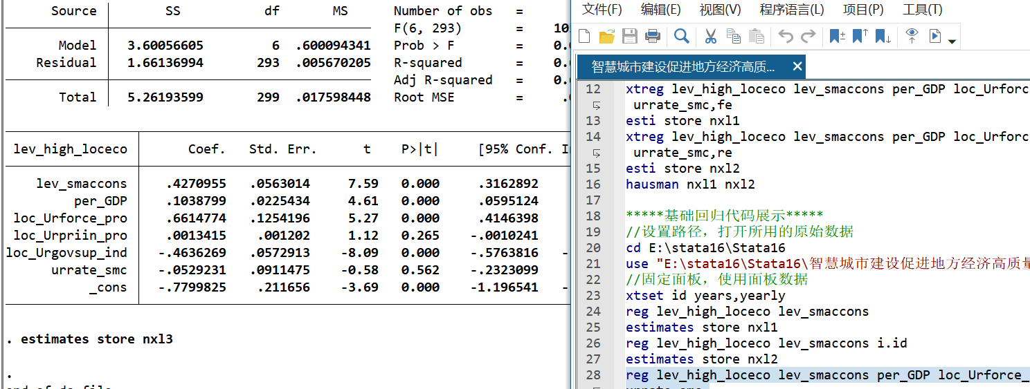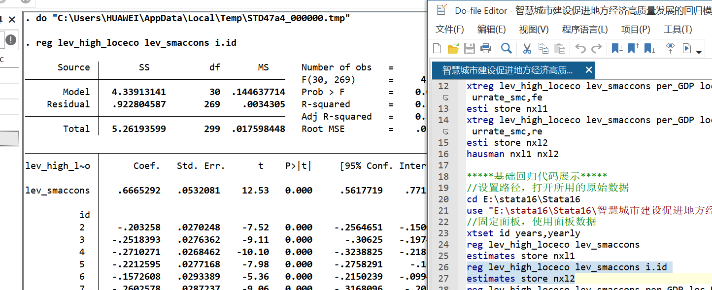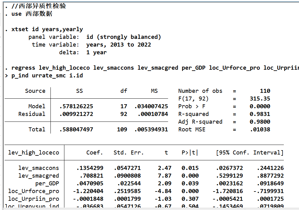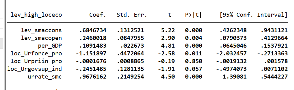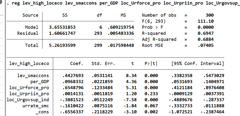 为验证H1,设定固定效应模型如下: lev_high_loceco(it) = α0 + α1lev_smaccons(it) + α2control(it) + μi + vt + ε(it)