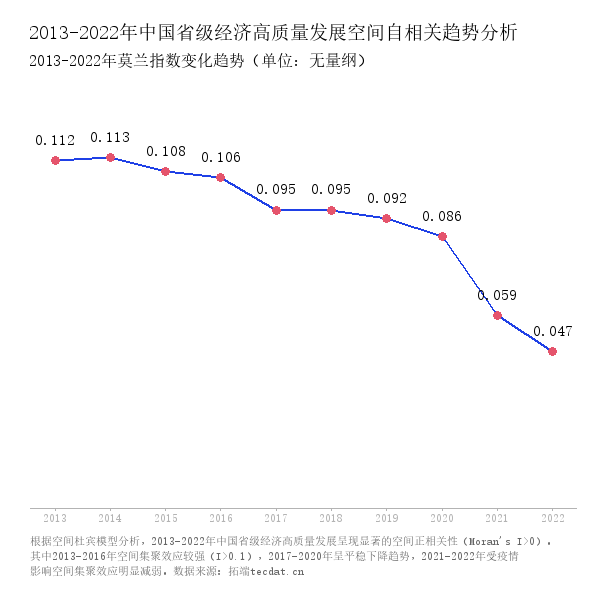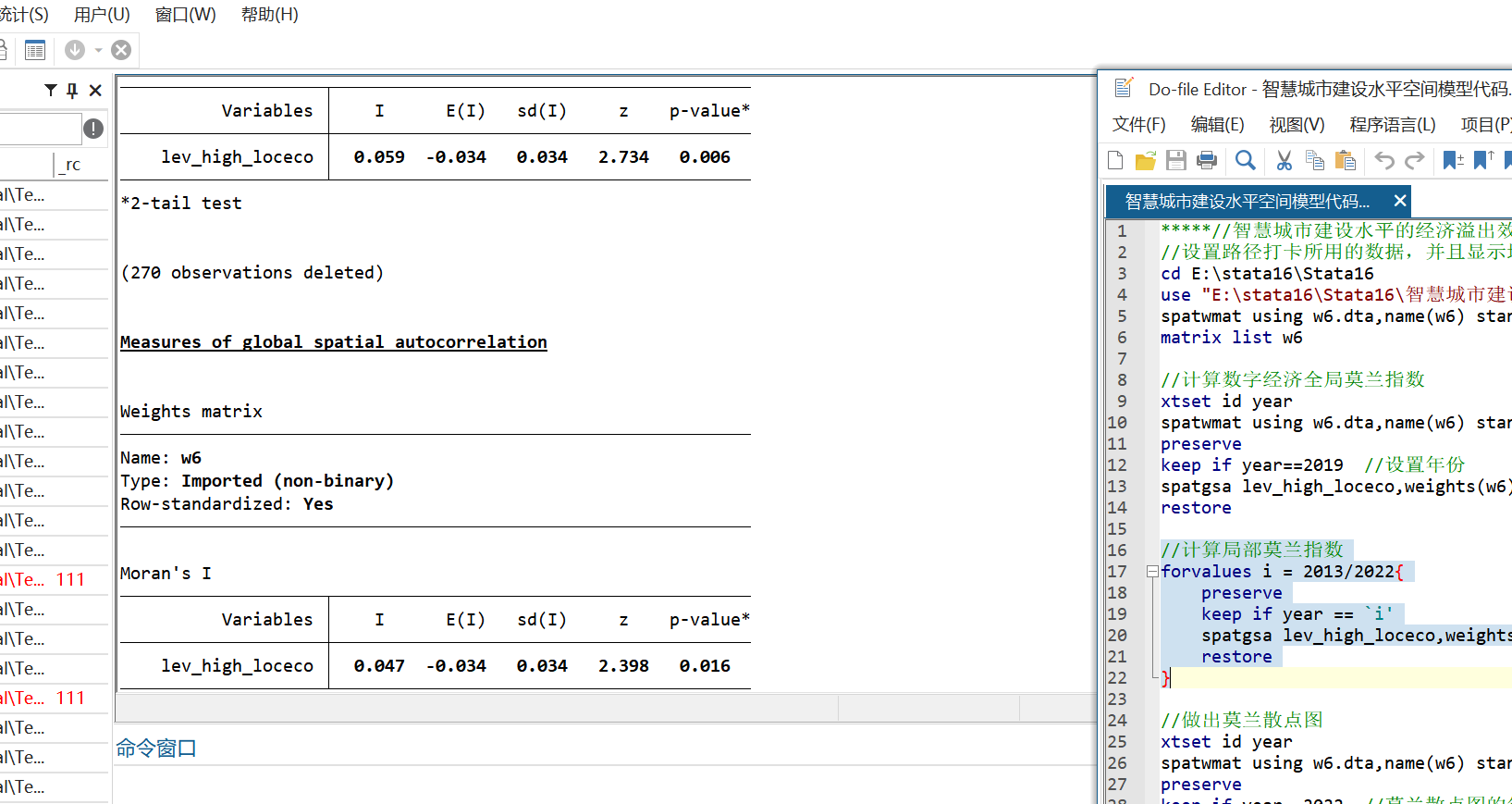 通过Stata计算2013-2022年莫兰指数(Moran’s I),结果如下表所示(选取部分年份):