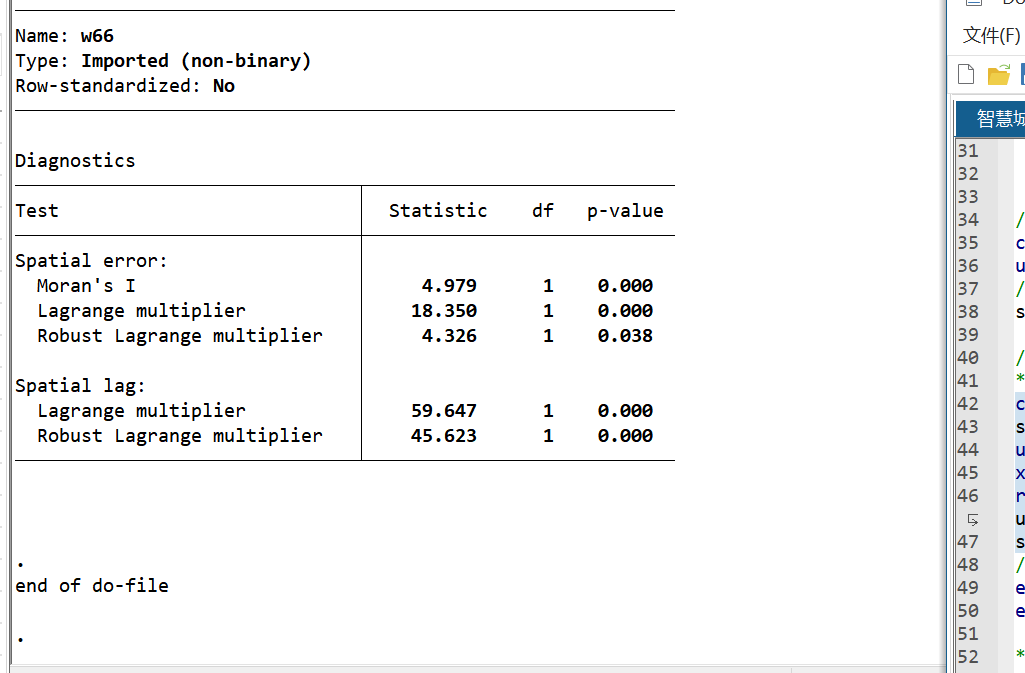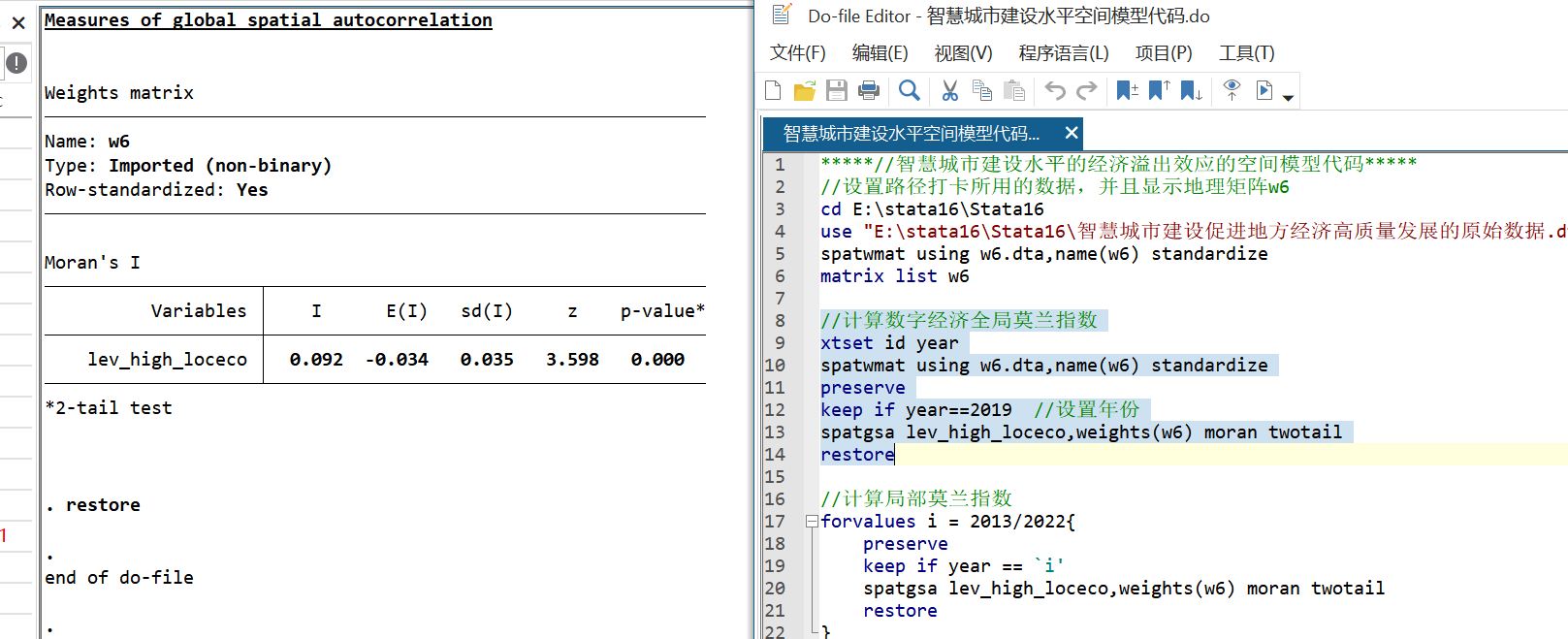 为验证H2,先通过莫兰指数检验空间自相关性,再构建SDM模型: lev_high_loceco(it) = ρWlev_high_loceco(it) + βlev_smaccons(it) + θW*lev_smaccons(it) + X(it)*γ + μi + vt + ε(it)