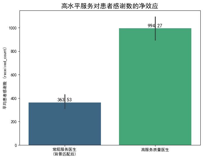 由此计算出,高水平服务行为对患者感谢数的平均处理效应(ATT)高达 +630.74。这一效应不仅在数值上是巨大的,在统计上也极度显著(配对T检验 p-value < 0.0001)。