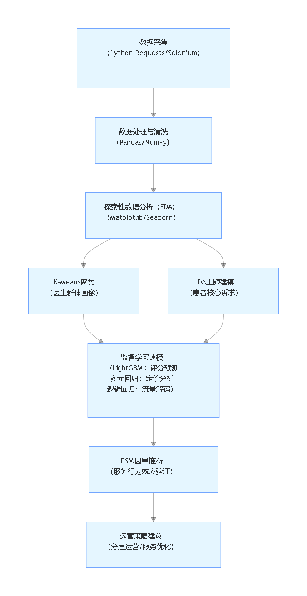 本次分析以 Python 为核心工具栈,串联数据采集、清洗、探索性分析(EDA)、机器学习建模与因果推断全流程:先用 K-Means 聚类勾勒医生群体画像,再借 LDA 主题模型挖掘患者隐性诉求,随后通过 LightGBM、多元回归等监督学习量化评分、定价、流量的驱动因素,最后用倾向性评分匹配(PSM)验证服务行为对满意度的因果效应。整个过程既解决实际业务痛点,也为数据科学初学者提供 “从业务到模型” 的完整思路。