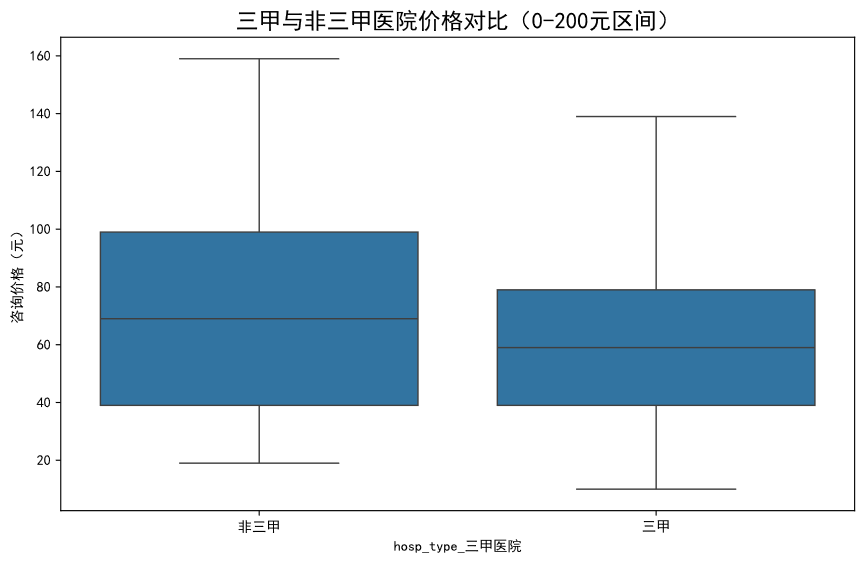 交叉分析显示,平台流量最大的医生群体组合是“三甲医院背景且无医保资质”,而平均服务价格最低的群体组合是“非三甲医院背景且有医保资质”。这暗示平台可能存在两类主流用户:一类是追求顶尖医疗资源、对价格不敏感的“声誉优先型”用户;另一类则是寻求基础医疗保障、对价格敏感的“性价比优先型”用户。