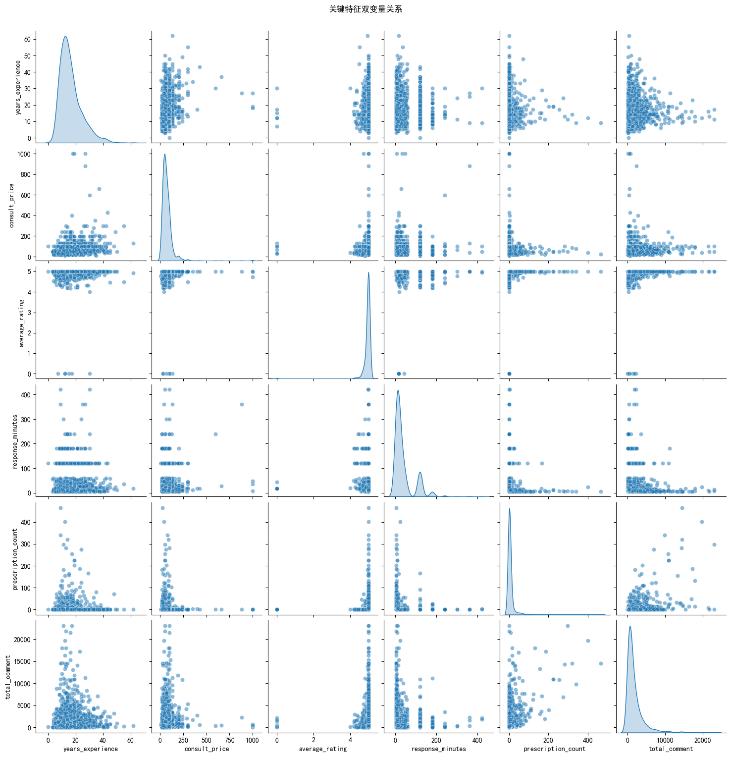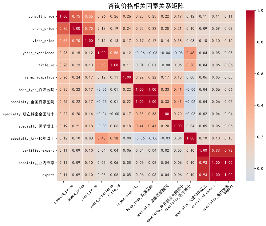 分析显示,医生的从业经验与职称等级存在高达0.58的强正相关性。同时,这两者均与服务价格显著正相关。这表明平台的定价体系在很大程度上遵循了传统医疗领域“论资排辈”的价值逻辑,资历是医生服务价值的核心体现。