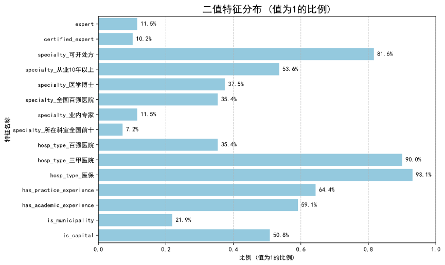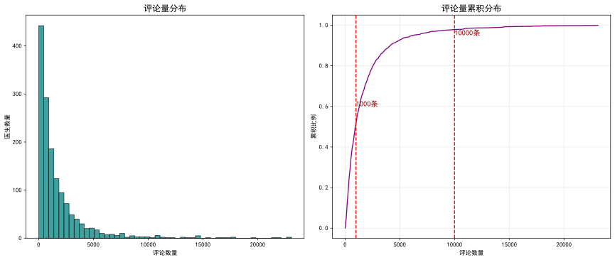 服务量相关指标,如total_comment(总评论数)和patient_count(服务患者数),均呈现严重的长尾分布。少数头部医生占据了平台绝大部分的患者与流量资源,而超过半数的医生服务量相对较小。这揭示了平台生态中流量高度集中的现状。