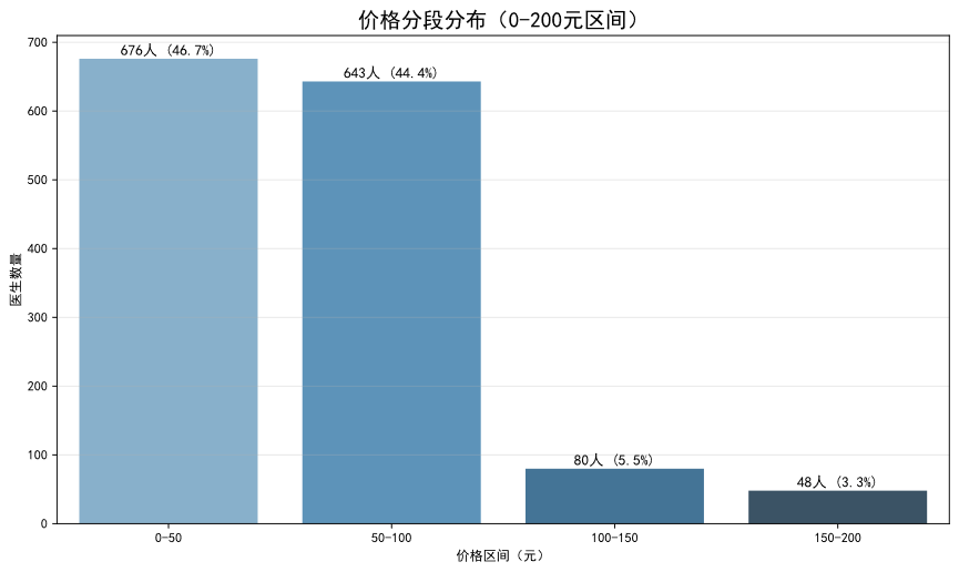 绝大多数在线图文咨询服务的定价集中在50至150元人民币区间。服务定价超过200元的医生占比仅为2.0%,表明高价位服务在当前市场环境下仍属小众,平台的主流用户对价格较为敏感。
