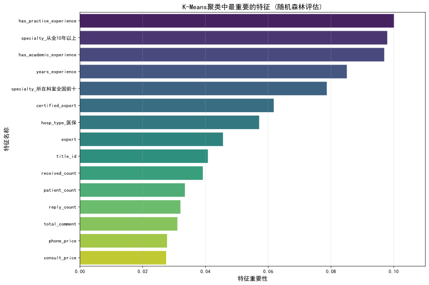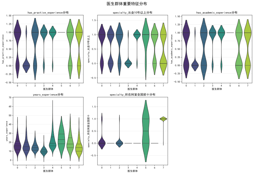 K-Means聚类分析不仅验证了平台医生群体的内在异质性,更重要的是,它超越了单一维度的标签,识别出了具有不同职业发展路径的医生群体。例如,“双栖发展型”、“临床实践型”与“转型期专家”等画像,为平台实施人才分层运营提供了清晰的目标客群。平台可据此进行精准的资源匹配、内容合作邀约及个性化的职业发展支持。