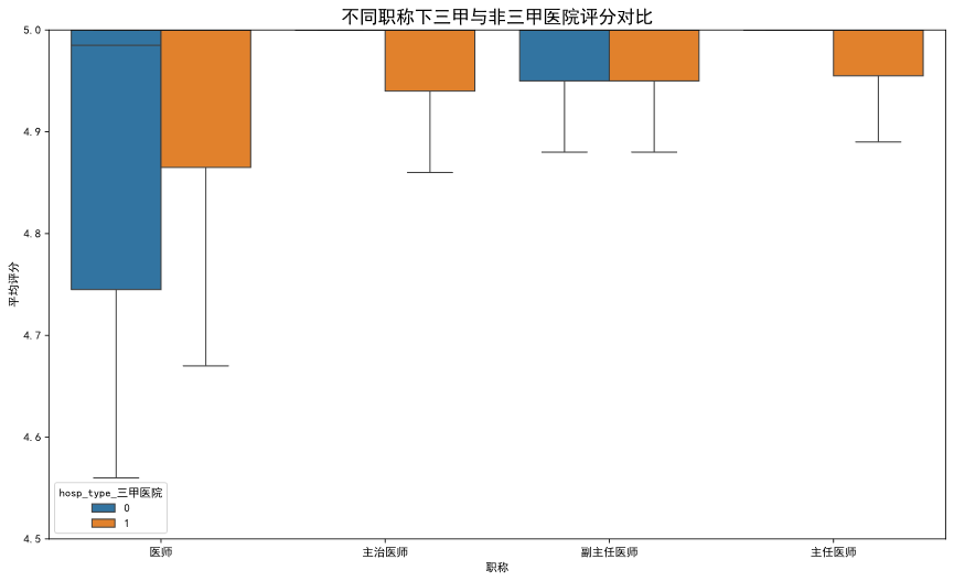 尽管三甲医院的医生在数量上占绝对优势(90%),但在核心的患者满意度指标average_rating上,非三甲医院医生的平均表现与三甲医生并无统计学上的显著差异(p=0.13),甚至略高。这初步表明,医院的“金字招牌”并不能完全等同于线上的服务体验质量。