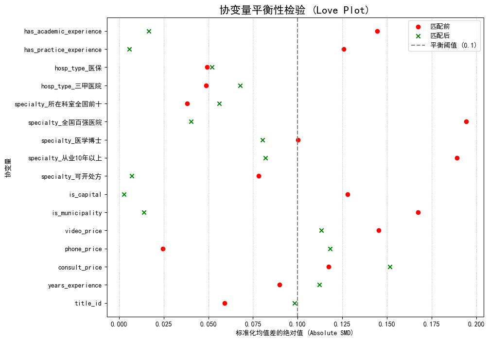 我们同样注意到,少数变量如hosp_type_医保和video_price在匹配后的SMD值虽然有所降低,但仍略高于0.1的严格阈值。这在真实世界数据的PSM分析中是常见现象,它提示我们匹配可能未能完全消除所有可观测变量的差异。然而,核心在于PSM已经将整体的组间差异从一个非常不平衡的状态,改善到了一个高度近似平衡的状态。这为我们进行下一步的因果效应评估,提供了一个远比原始数据更公平、更可靠的比较基础。
