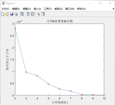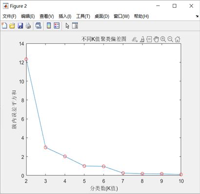 clc;clear;A = importdata('gaojia.txt');data=mapminmax(A,0,1);[n,p]=size(data);K=10;D=zeros(K,2);for k=2:K[lable,c,sumd,d]=kmeans(data,k,'dist','sqeuclidean');sse1 = sum(sumd.^2);D(k,1) = k;D(k,2) = sse1;endplot(D(2:end,1),D(2:end,2))hold on;plot(D(2:end,1),D(2:end,2),'or');title('不同K值聚类偏差图') xlabel('分类数(K值)') ylabel('簇内误差平方和')
