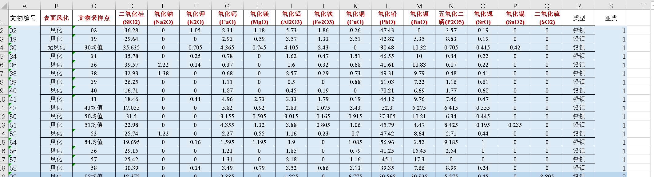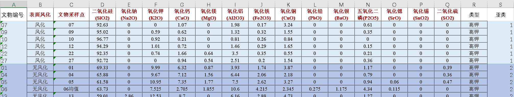 关键发现:高钾玻璃风化后SiO₂含量升高(平均超93%),其他成分含量下降;铅钡玻璃风化后SiO₂减少37.1%,PbO增加56.27%。