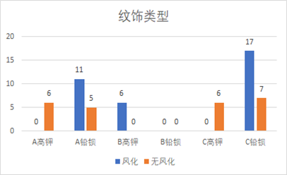 下图为纹饰与风化的关联柱形图,整体无明显规律,但可观察到纹饰B的玻璃均风化。