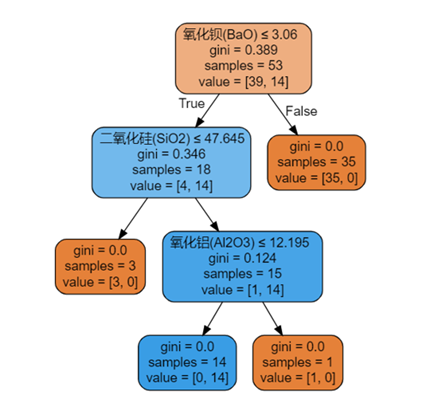 若剔除PbO特征,决策树显示氧化钡(BaO)为首要特征(重要性69.8%),其次是二氧化硫(SO₂,21.2%)、氧化铝(Al₂O₃,9.1%),分类准确率仍为100%。 下图为无PbO特征的决策树判定图,展示多特征协同分类逻辑: