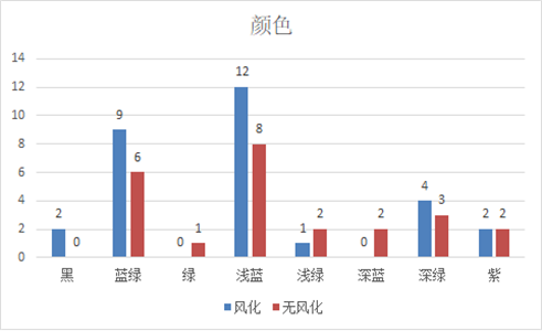 下图为颜色与风化的关联柱形图,整体无明显规律,但黑色玻璃均风化、绿色与深蓝色玻璃均未风化。