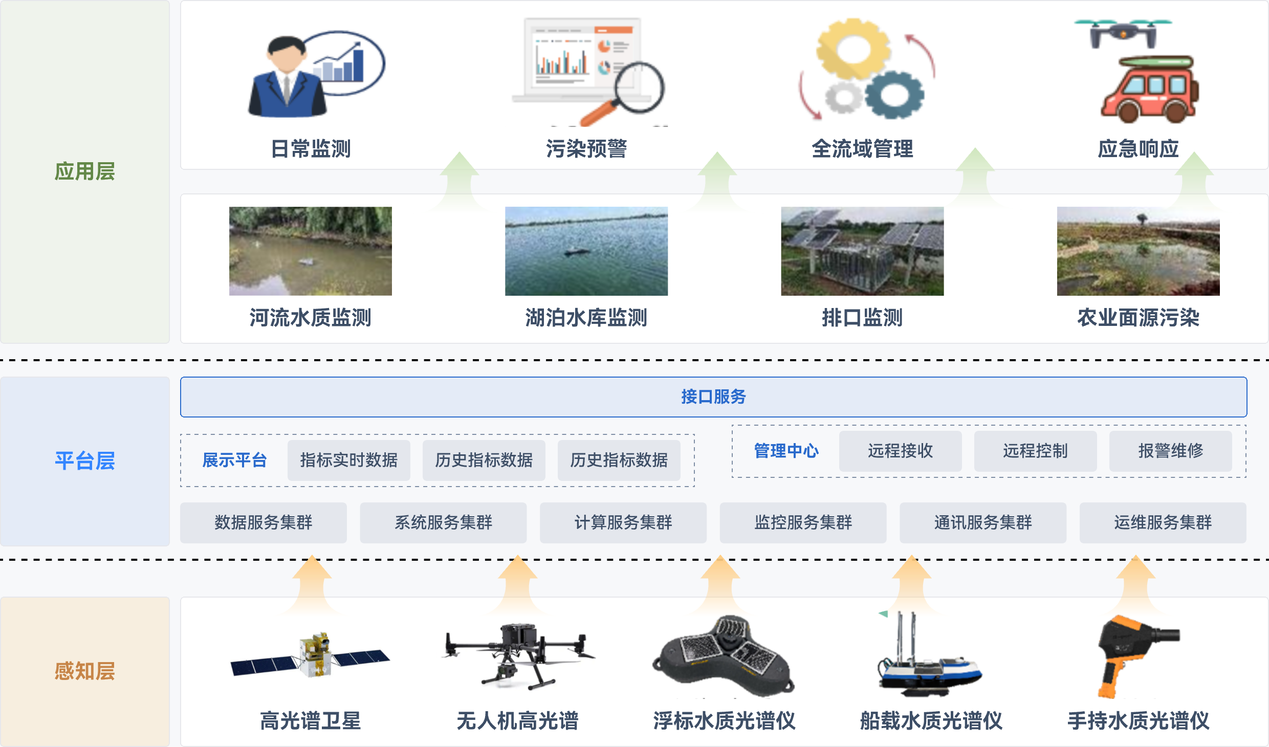 随着高光谱遥感技术的持续发展,高光谱传感器具备了负载于卫星、无人机、地面基站、船舶等平台的能力。在水质检测中,高光谱遥感水质在线监测系统可集成卫星的长时序、大范围监测能力,结合无人机快速机动、灵活部署的特点,以及地面站监测指标全面、可全天候作业的优势,实现大范围水域从点到面的长时间持续快速监测。