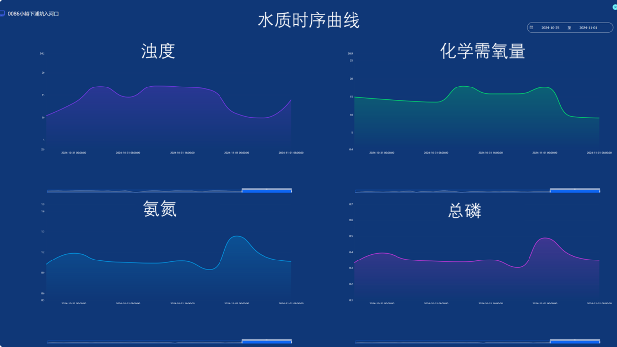 对卫星和地面站光谱反演的水质时序数据进行多时间尺度展示及分析,并对指标超标的样本进行预警。