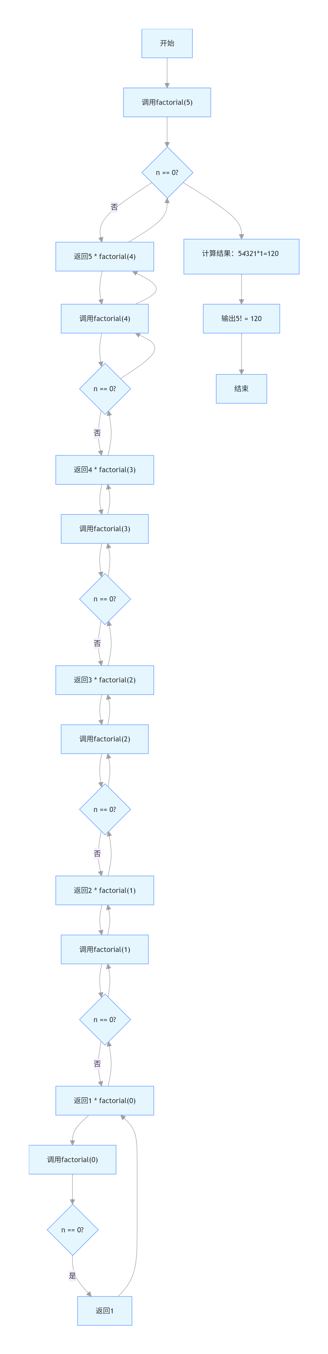 递归方法的基本思想是将问题分解为更小的子问题,直到达到一个可以直接解决的基础情况。对于阶乘来说,基础情况是当n=0时,阶乘结果为1。对于其他情况,n! 可以表示为 n * (n-1)!。