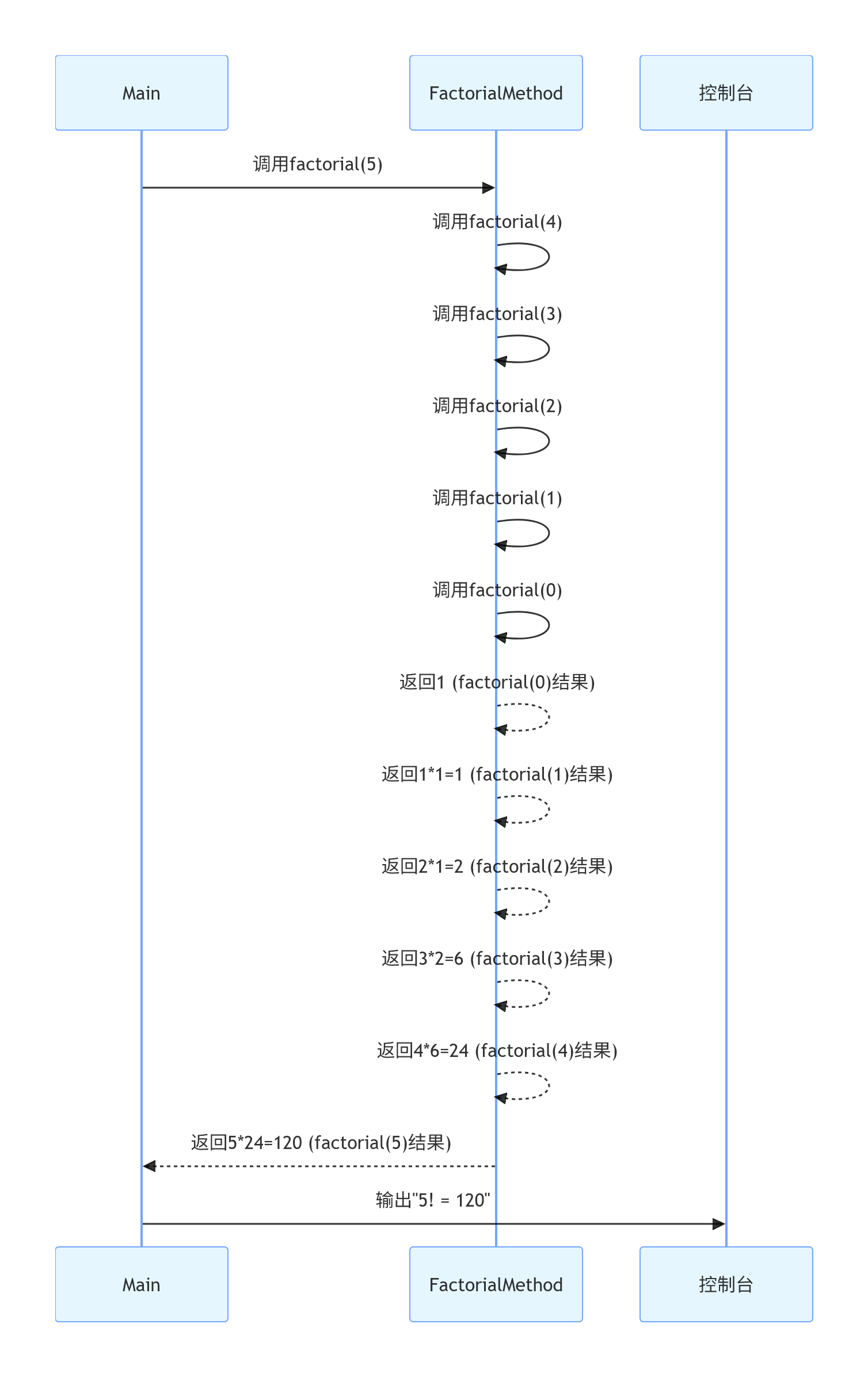 }factorial 接收一个整数参数 n。n 等于0,返回1。这是因为0的阶乘定义为1。n 不等于0,则返回 n 乘以 factorial(n - 1) 的结果。这里 factorial(n - 1) 是对 factorial 方法的递归调用。main 中,我们设置要计算的阶乘数 number 为5,并调用 factorial 方法计算其阶乘值,最后打印结果。