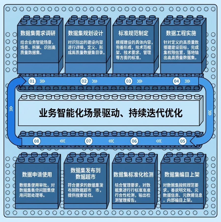 以数据集的全生命周期管控为目标,从现状需求分析识别、数据规划、标准制定、数据工程(采、处、标、存、测等)、编目上架、数据治理监管、发布应用。最终实现数据集的开放与供给,对内支撑算法模型的迭代优化,对外提供市场化的服务,以实现数据集价值的最大化。