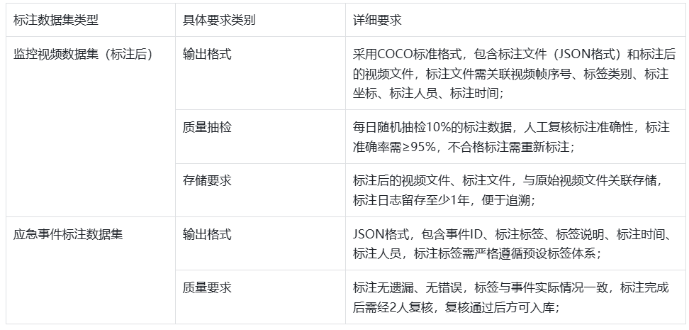 针对需要用于AI模型训练、推理的数据集(如监控视频数据集、应急事件标注数据集),明确标注输出格式、质量抽检要求,确保标注结果可直接被指挥中心大脑的AI模型调用: