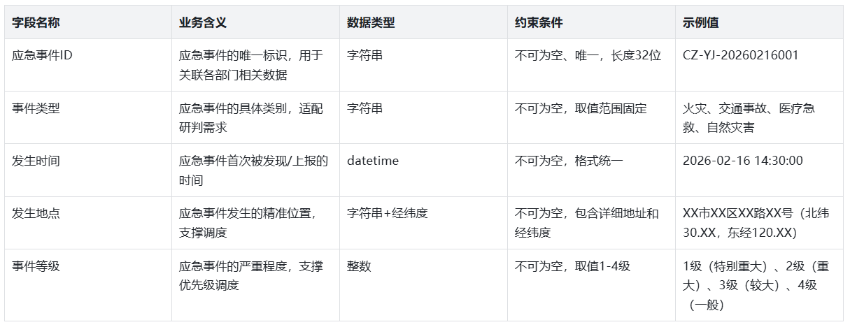 以“应急事件融合数据集”为例,明确每个字段的业务含义、数据类型、约束条件和示例值,确保公安、消防、卫健委等多部门提供的数据“同源、同径、同标”,示例如下: