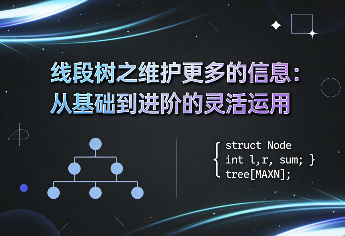 在算法学习中,线段树绝对是当之无愧的万能数据结构,它凭借分治思想和高效的区间操作能力,能轻松应对单点修改、区间查询、区间修改等经典问题。但实际刷题时,我们遇到的场景远不止维护区间和、最大值这么简单 —— 可能需要统计区间亮灯数、计算不同地雷种类、维护等差数列加成,甚至是处理 01 序列的连续最长子段。这时候,线段树维护更多类型信息的能力就成了解题的关键。 本文就带大家从基础出发,深入探索线段树如何灵活维护各类复杂信息,从结构体设计、懒标记处理到具体例题实战,一步步拆解核心思路,让你彻底掌握线段树的进阶用法!下面就让我们正式开始吧!