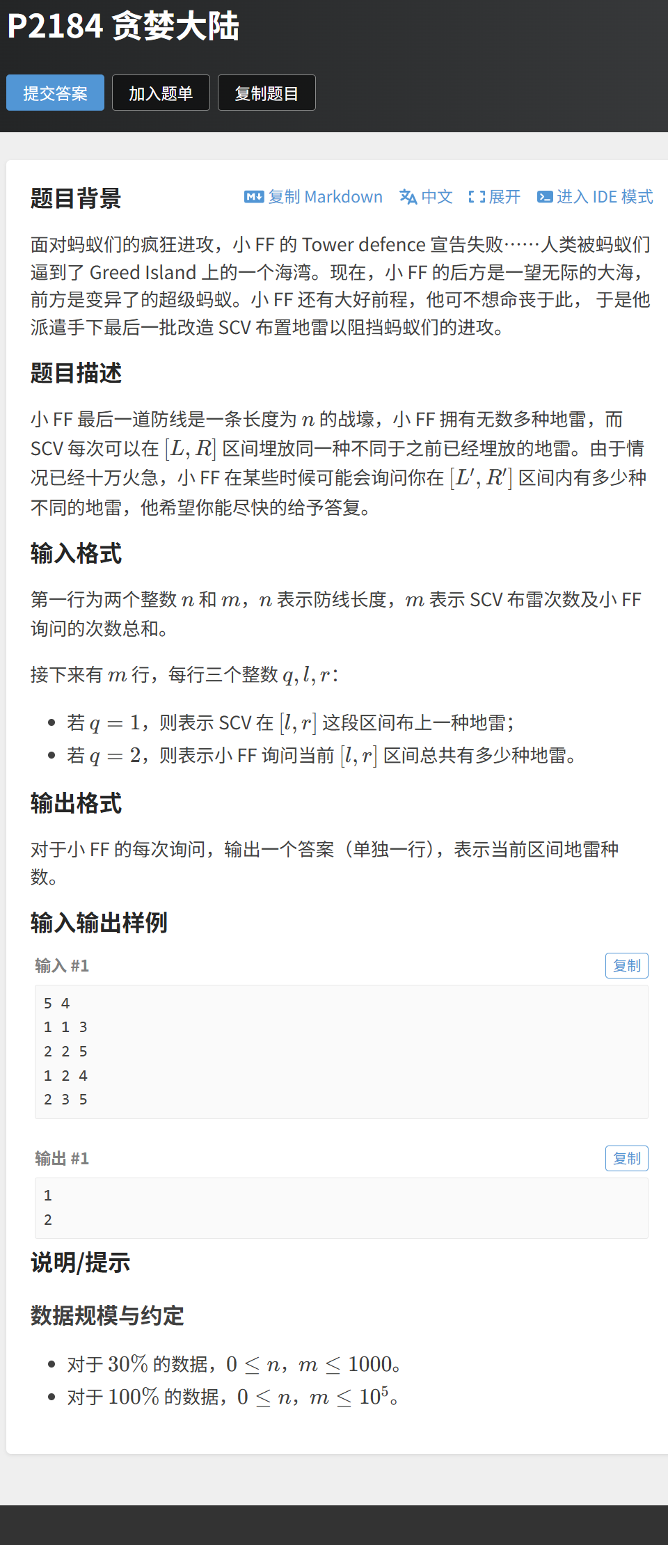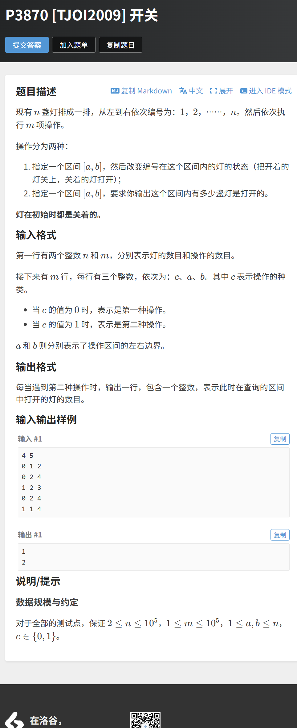 [a,b]翻转灯的状态(开→关,关→开);[a,b]内打开的灯的数量。这道题需要维护区间亮灯数,同时处理区间翻转的修改操作,核心是设计翻转懒标记,并明确标记下放时如何更新子节点的亮灯数。