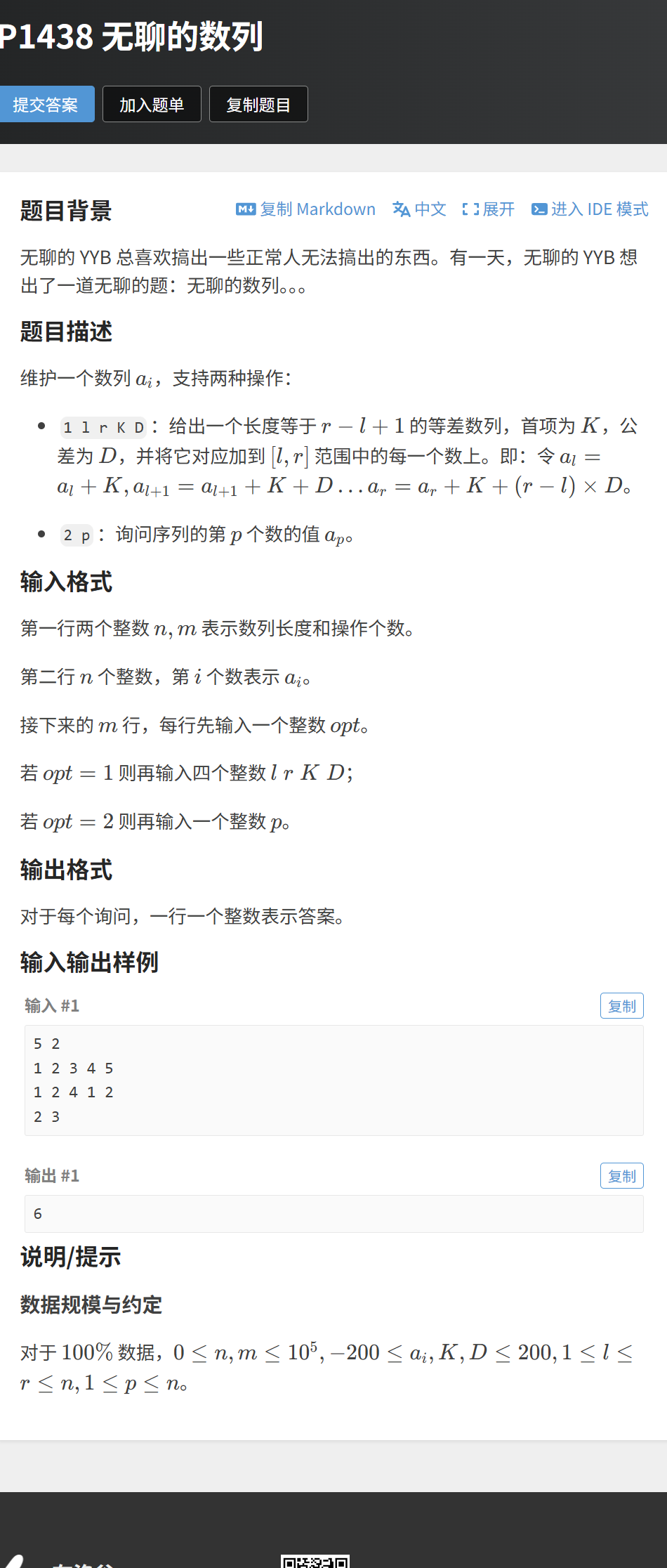 }核心转化:将区间等差数列加成,转化为三次区间单点修改,用基础的区间和线段树即可实现,无需复杂的懒标记。