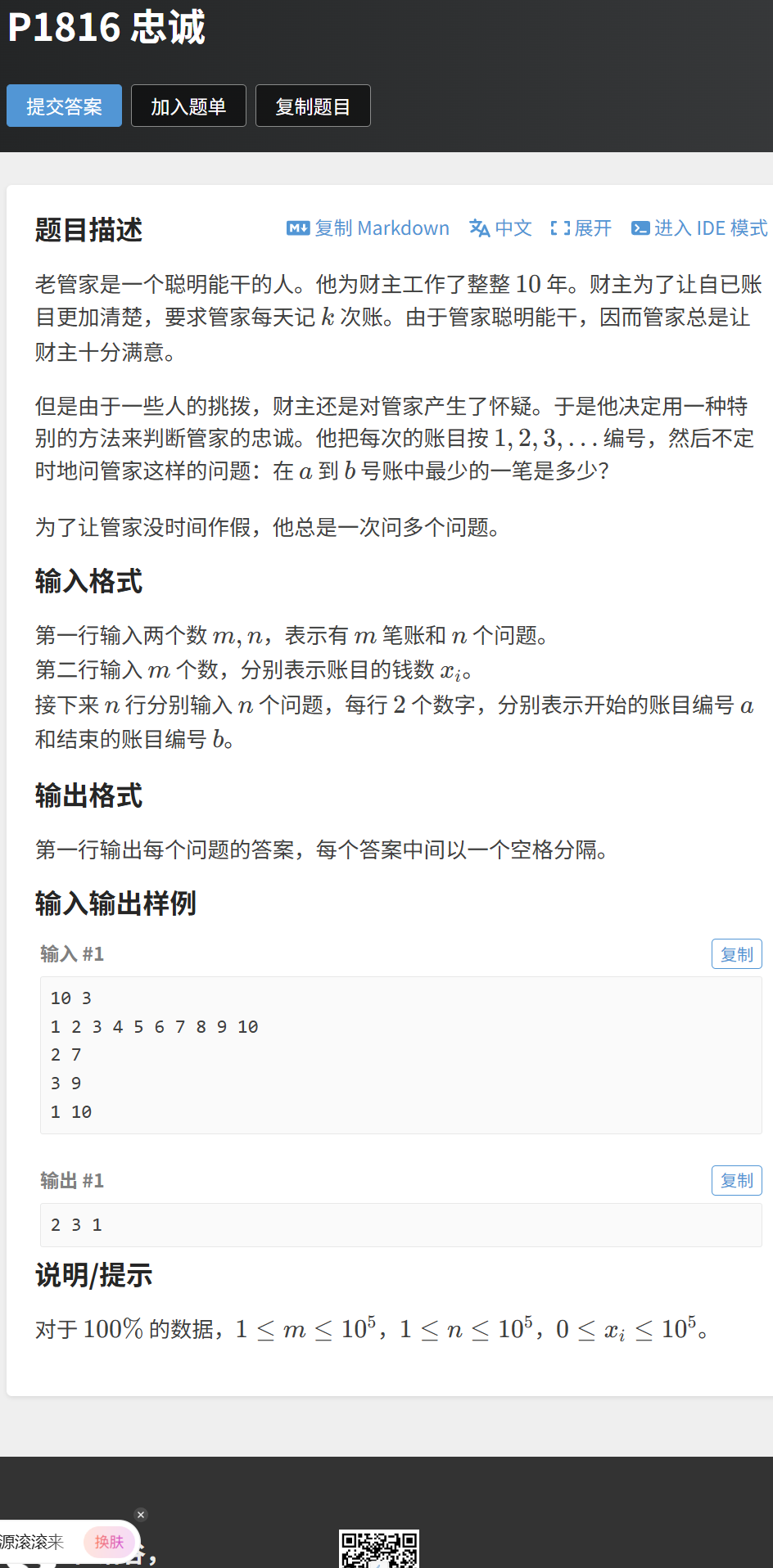 题目链接:https://www.luogu.com.cn/problem/P1816