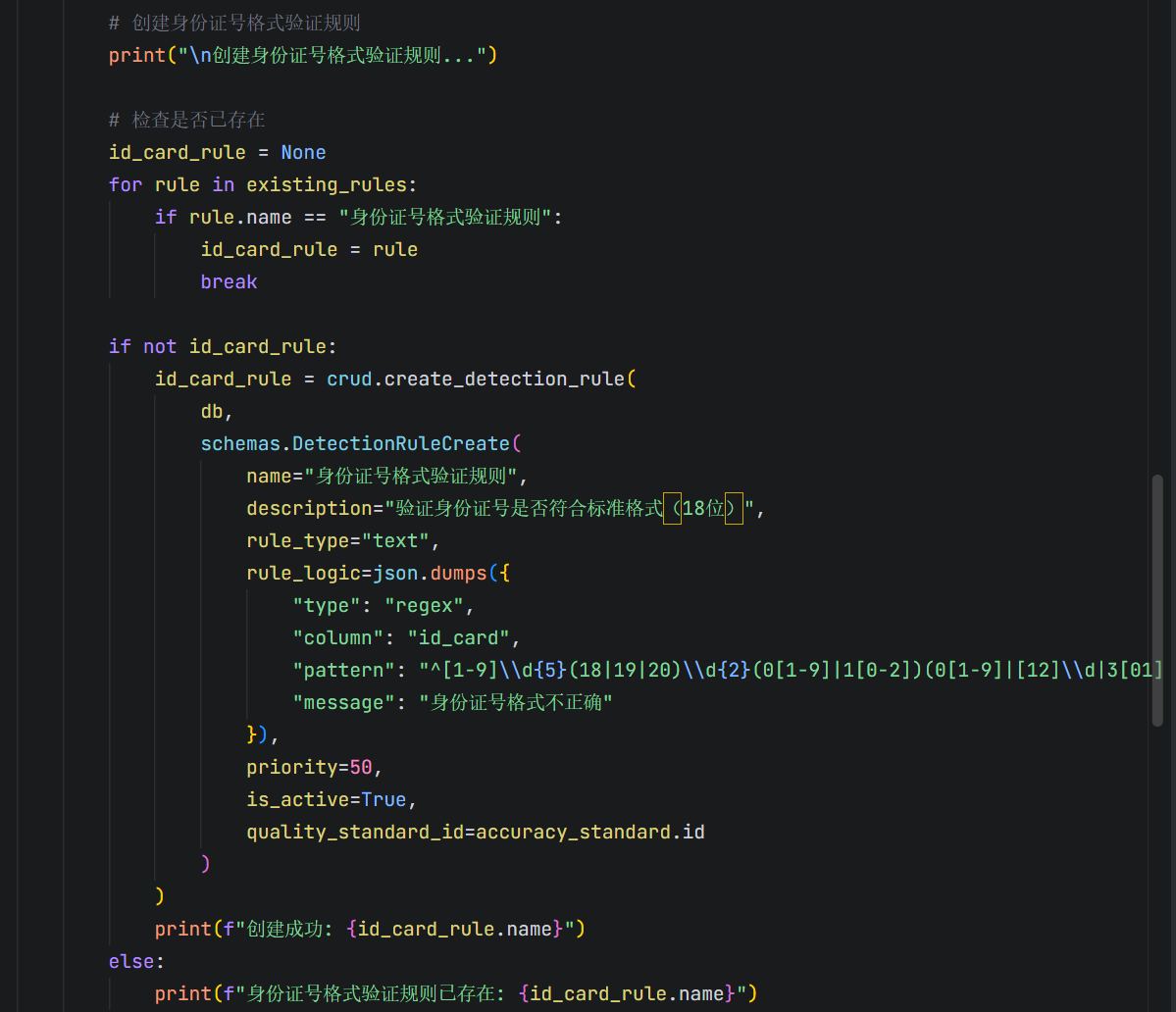 智能贯标检查智能体基于清晰的上中下三层架构设计,实现了从数据接入到质量检测、异常识别、智能修复的全流程自动化管理。上层的前端应用层提供直观的可视化界面,用户可通过仪表盘实时监控数据质量状况,快速创建检测任务,配置检测规则,并查看详细的检测报告;中层的后端服务层作为系统核心,集成了强大的规则引擎和AI功能模块,能够自动适配不同类型的数据,执行多维度的质量检测,同时结合异常检测算法识别数据中的异常值、缺失值和无效格式,生成智能修复建议;下层的数据层确保所有检测数据和结果的安全存储与高效检索。