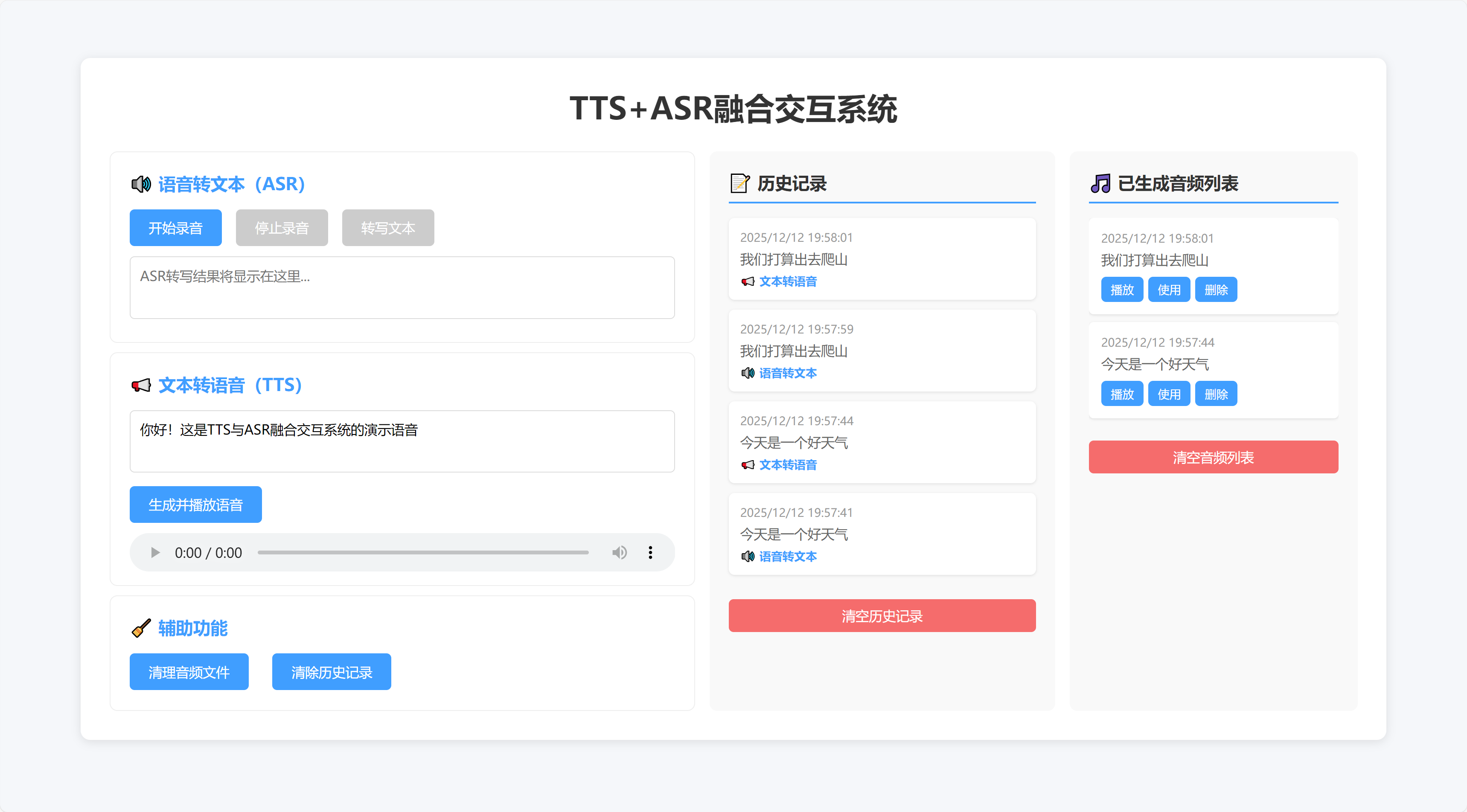 今天我们聚焦易用性与交互流畅性”的 TTS 与 ASR 融合交互闭环系统,采用 “前端可视化操作 + 后端轻量 API” 的架构设计,可实现 “语音输入→文本转写→语音输出” 的全流程自动化衔接,为解决传统语音技术单向转换的局限提供了一个初步的解决方案。