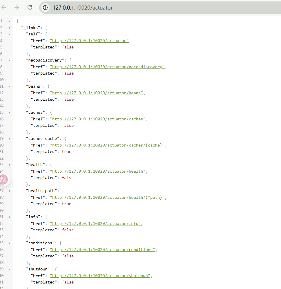 enabled: true3.测试:访问 http://127.0.0.1:10020/actuator,显示所有监控的信息链接