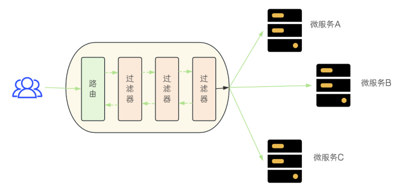 Predicate 决定了请求由哪一个路由处理。如果在请求处理前后需要加一些逻辑,这就是 Filter(过滤器)的作用范围了。