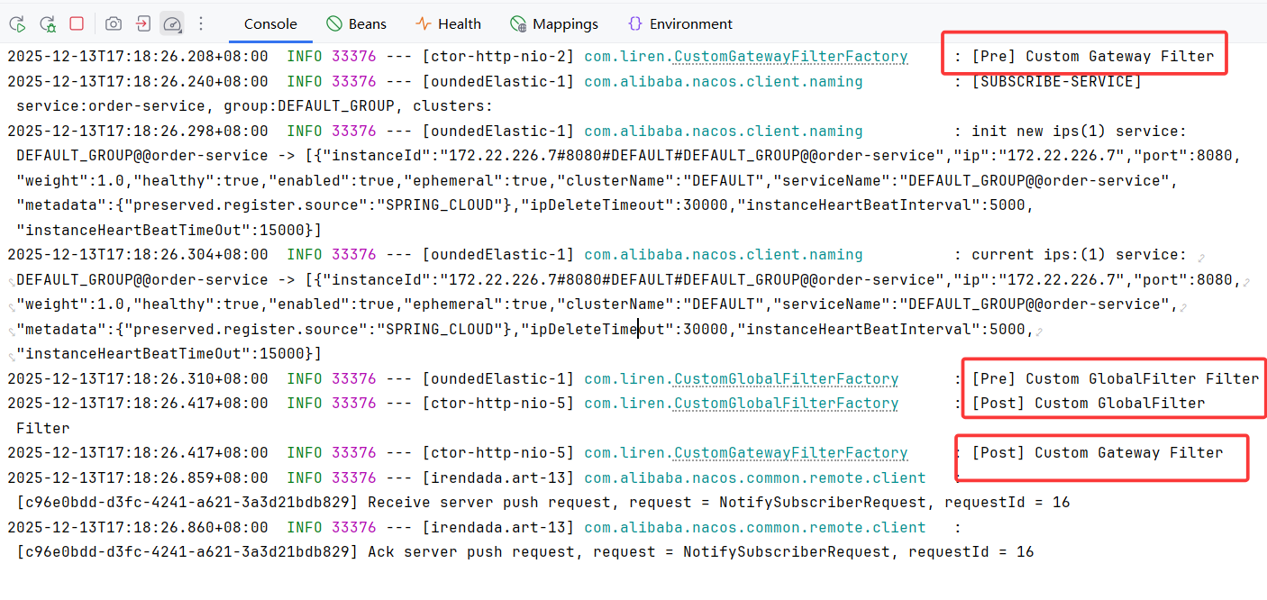 从日志中可以看出来,当 GatewayFilter 和 GlobalFilter 过滤器的 order 值一样时,会先执行 GatewayFilter。