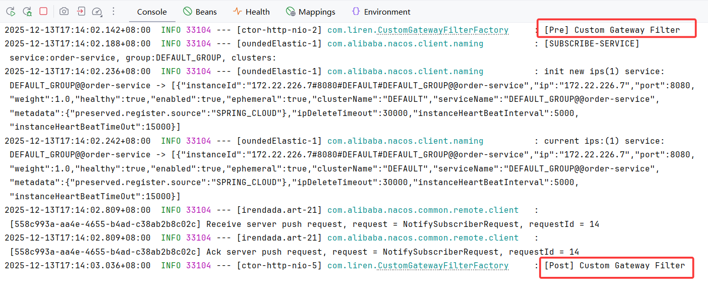 - After=2026-12-13T14:08:33.643172900+08:00[Asia/Shanghai]该 filter 只添加在了 order-service 路由下,因此只对 order-service 路由生效。