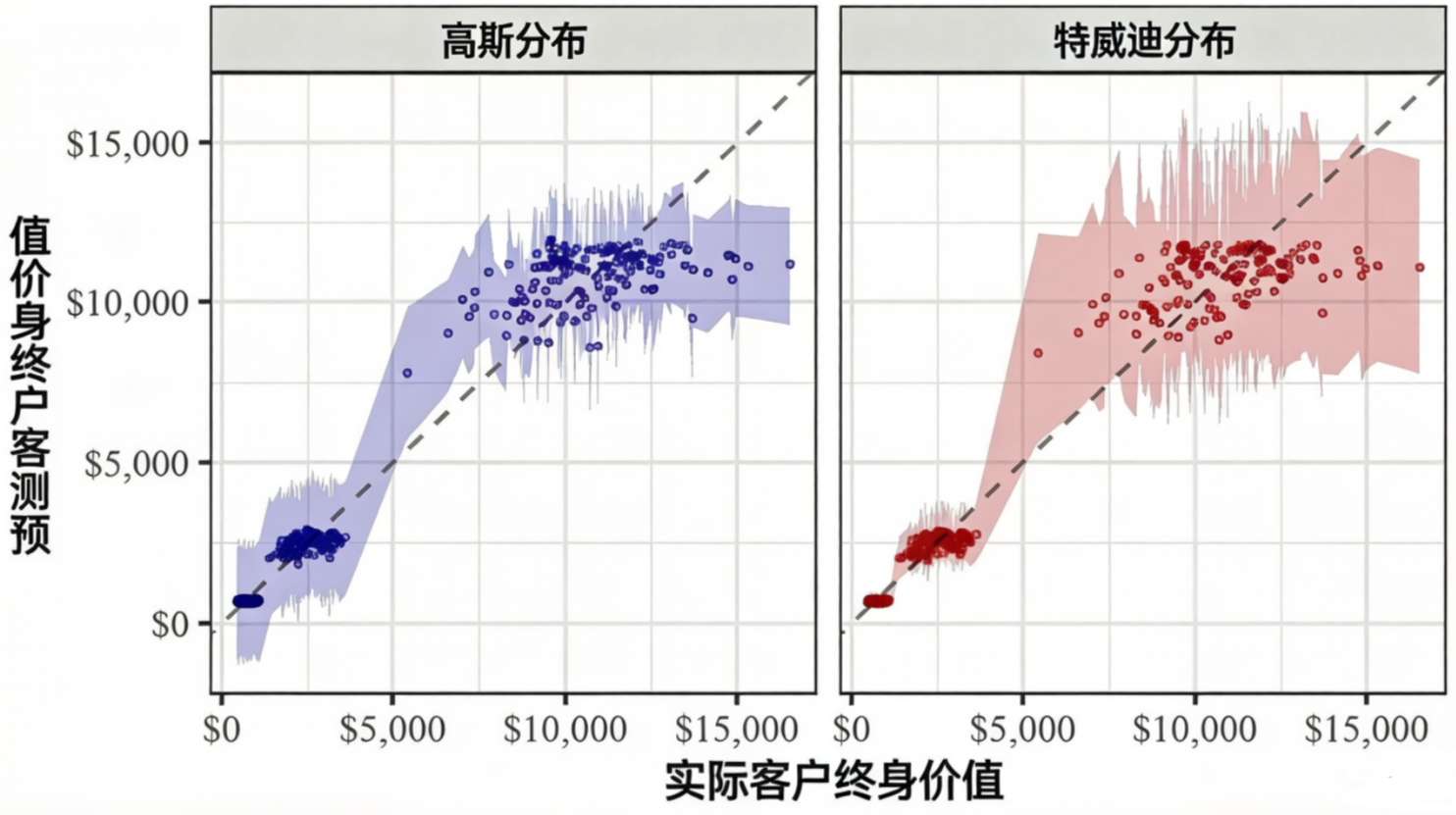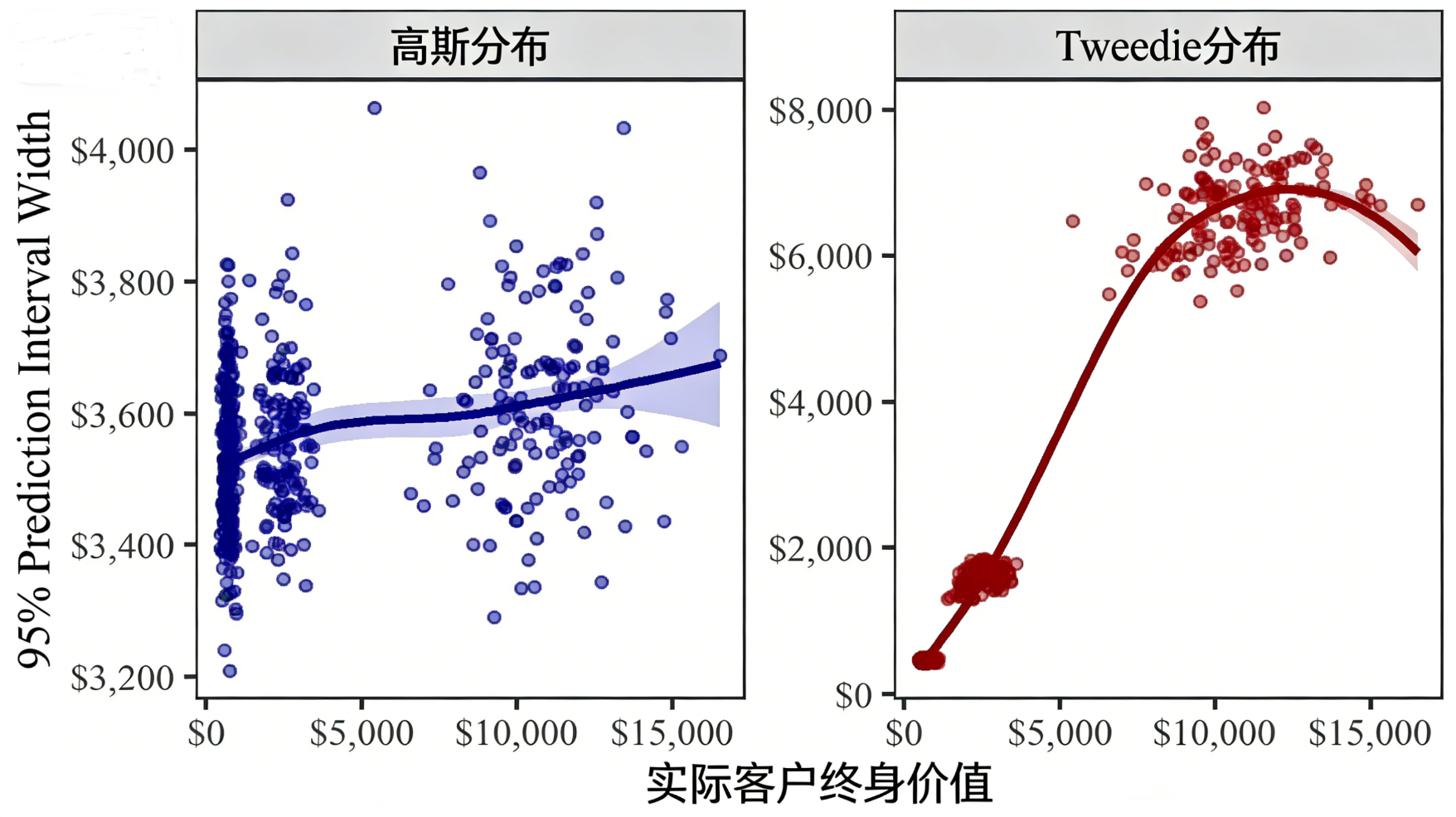 从预测区间对比图可清晰看到:高斯模型的预测区间宽度恒定,无法反映高价值客户的高波动性;而Tweedie模型的预测区间宽度随CLV增大而增加,贴合业务实际,为企业的风险评估提供了更准确的依据。