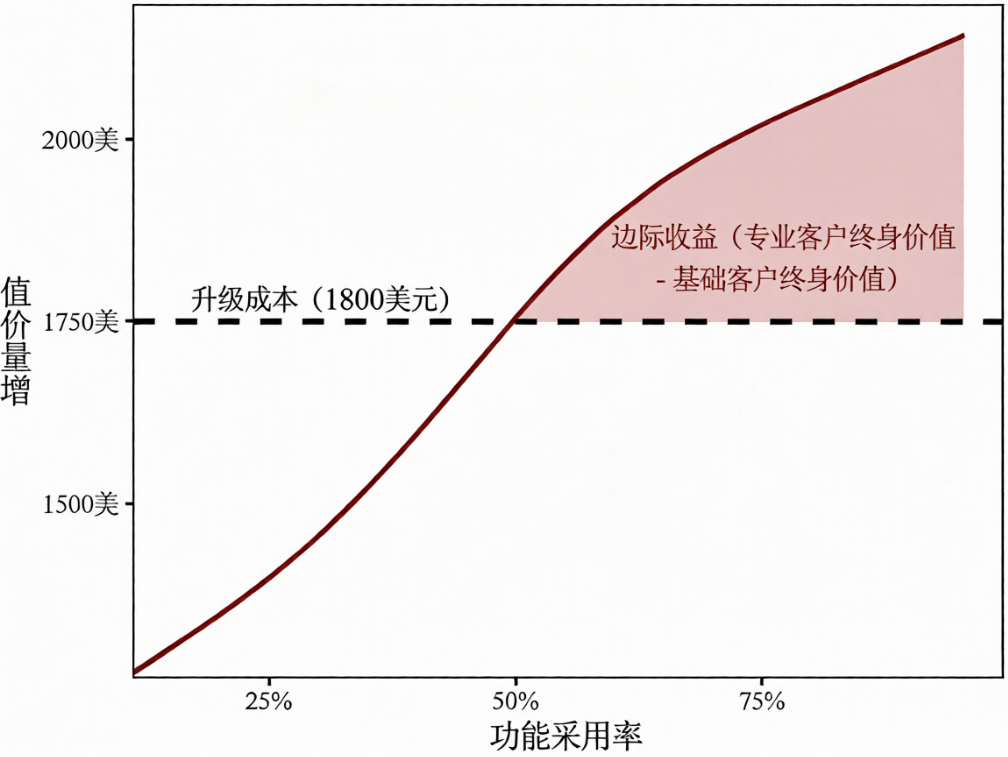 确定基础版客户升级为专业版的最优采纳率阈值,为客户运营策略提供决策依据。基础版与专业版的月费差为200元,6个月的升级成本为1200元,需找到采纳率临界点使升级后的CLV增量覆盖成本。