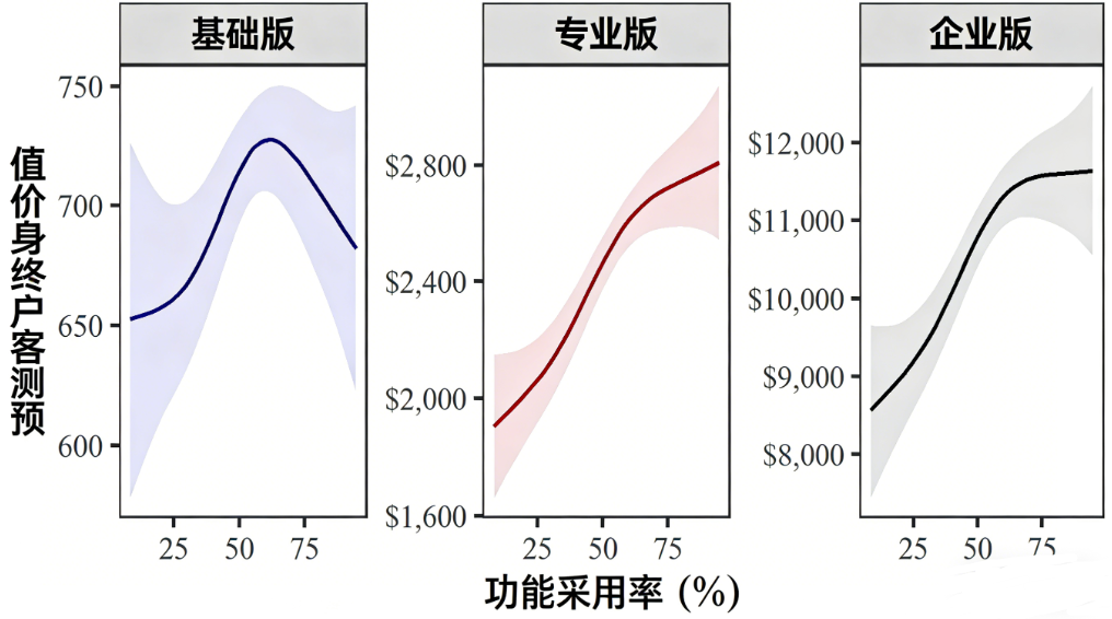 上图结果显示:企业版客户在功能采纳率75%左右出现明显饱和,CLV增长停滞;专业版客户呈平稳增长,高采纳率下略有饱和;基础版客户在采纳率50%后CLV反而下降,推测是功能复杂度超出基础版客户的使用能力,导致体验下降。