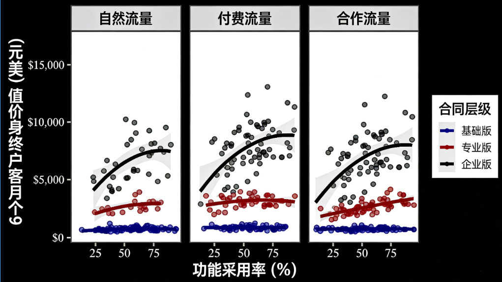从上图可看出,功能采纳率与CLV的关系并非简单线性:企业版客户呈现明显的饱和效应,基础版客户接近线性增长,付费获客渠道的初期CLV更高,但高采纳率下优势逐渐消失。