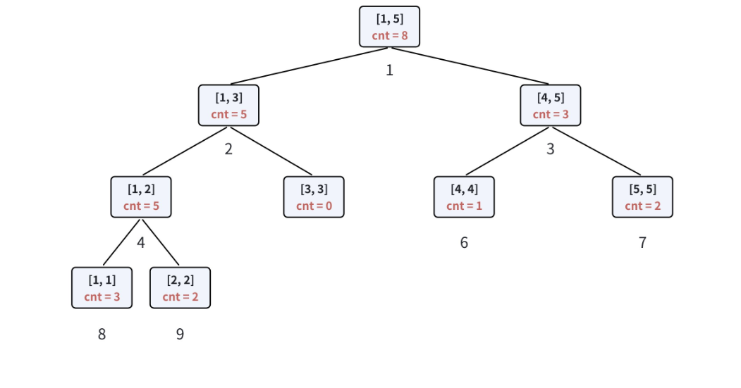 [1,5],cnt=8(总共有 8 个数);[1,3],cnt=5;右孩子:[4,5],cnt=3;[1,3]的左孩子[1,2](cnt=5)、右孩子[3,3](cnt=0);[1,2]的左孩子[1,1](cnt=3)、右孩子[2,2](cnt=2);[4,5]的左孩子[4,4](cnt=1)、右孩子[5,5](cnt=2)。