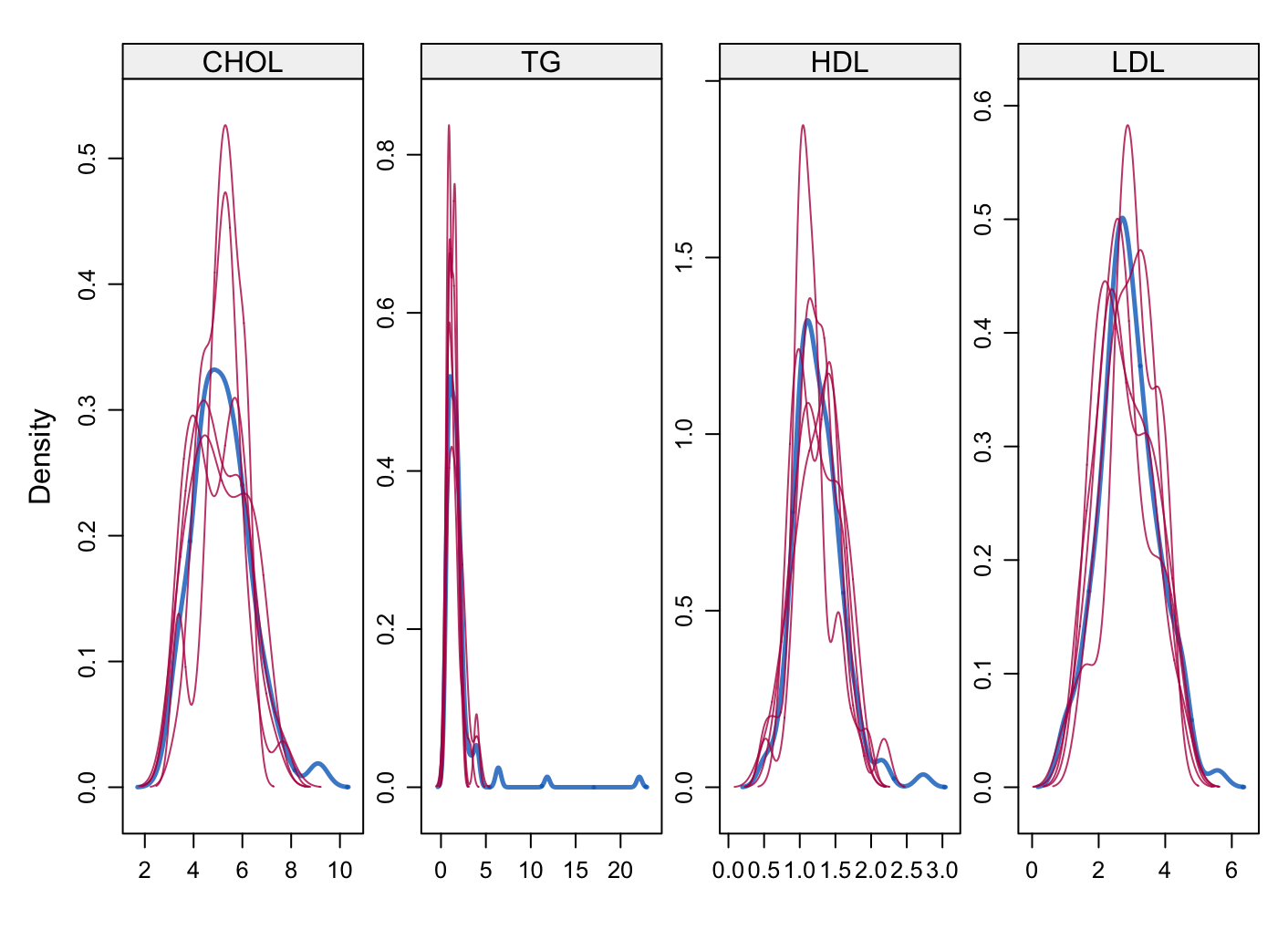 densityplot(imp,layout = c(4, 1))四个子图:分别对应CHO、T、HD、LDL四个变量;