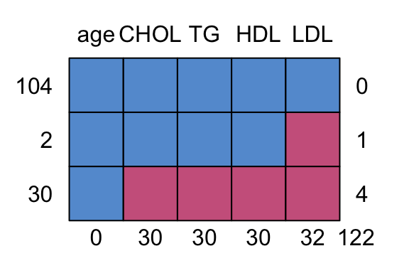 # 0 30 30 30 32 122列表示不同变量名称:age, CHOL, TG, HDL, LDL;