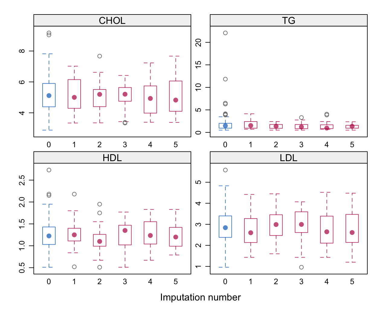 箱线图:红色箱线图表示每次插补中该变量所有插补值的分布;蓝色箱线图(仅在0处)表示原始观测值的分布;