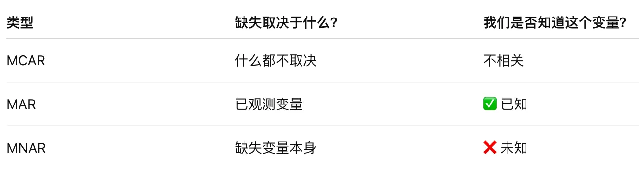 数据缺失的类型在统计学和医学研究中主要依据缺失机制(missing mechanism)进行分类,国际公认的标准分为三种,这一分类最早由Rubin(1976)提出,被广泛应用于临床试验、流行病学和生物统计领域。