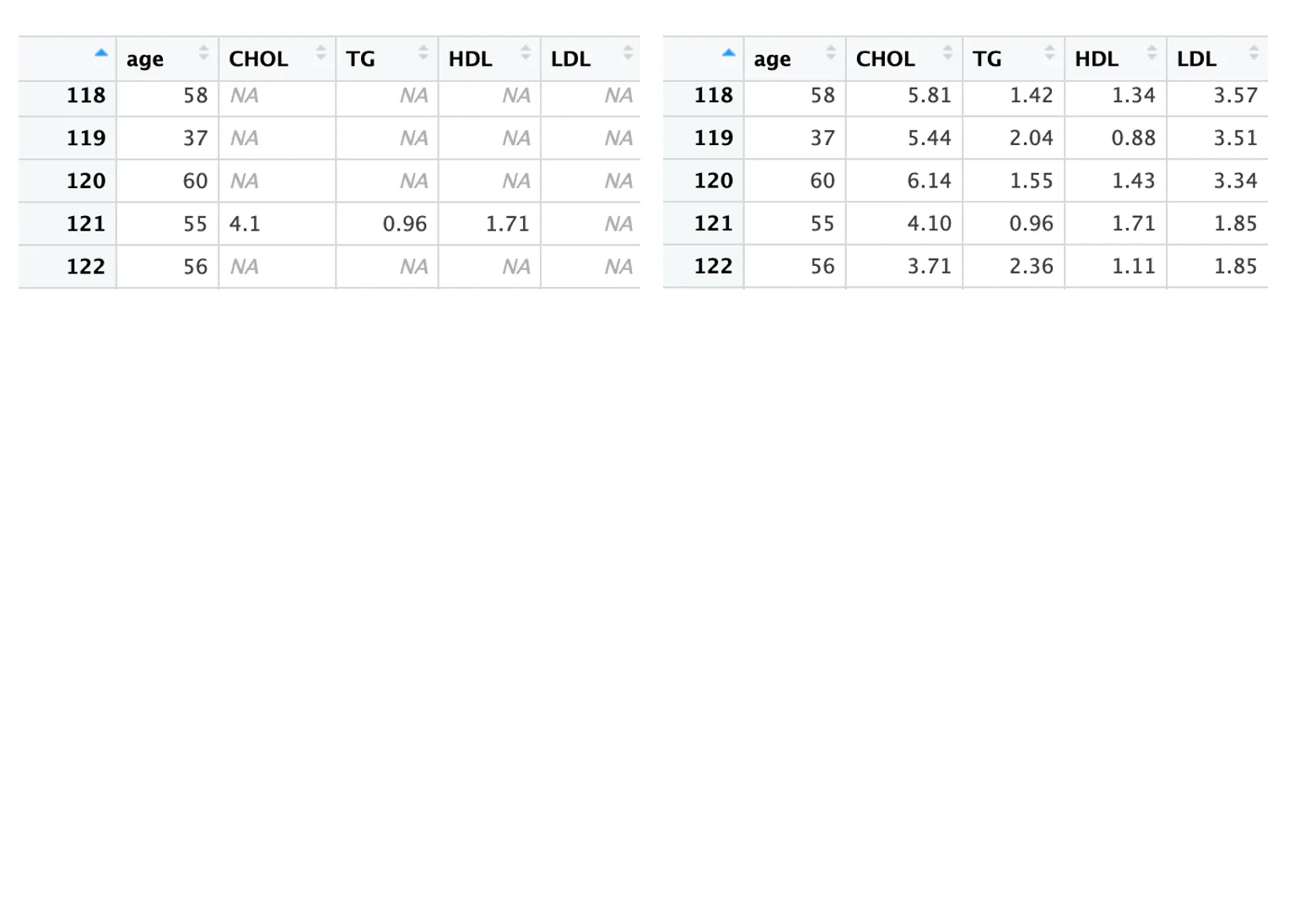使用数据是含有年龄和血脂相关指标的示例数据,其中年龄数据是完整的。