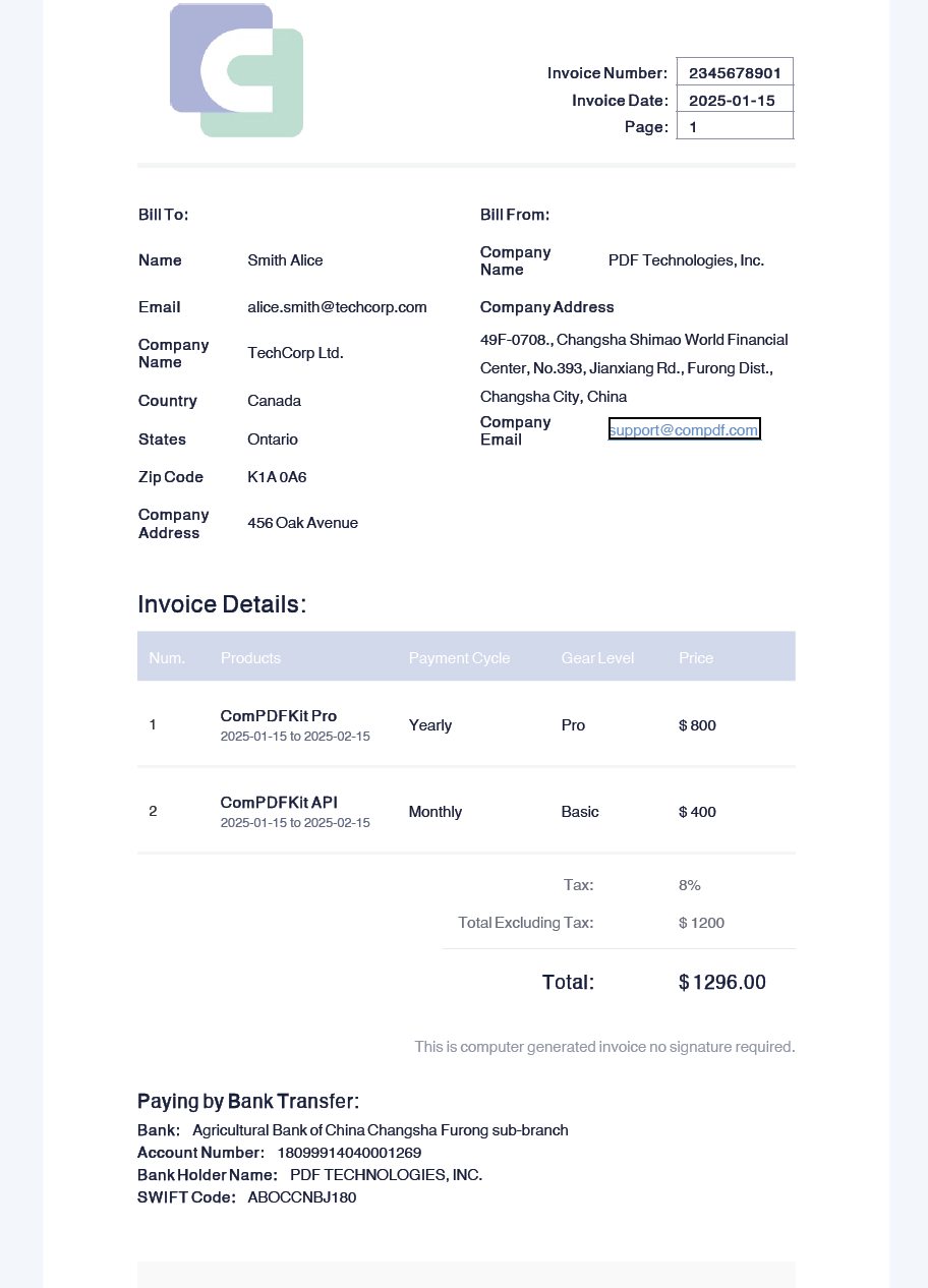 “从 HTML 生成”功能需要一个 HTML 模板和用于填充该模板的结构化数据(JSON 数据),以生成标准的 HTML 代码。然后,通过“从 HTML 生成”功能的相应界面,您可以将该标准 HTML 代码转换为 PDF 文档。下面是使用ComPDF 生成SDK的生成PDF文件的步骤
