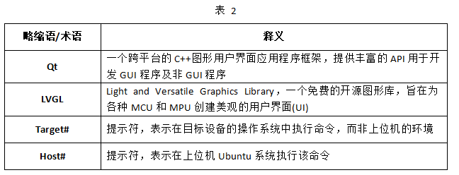 本文档提供基于Qt和LVGL的图形用户界面(GUI)的开发说明。其中Qt开发包含基于命令行和QtCreator的开发方式,以及Qt程序的开机自启动方法;LVGL开发仅提供基于命令行的开发方式。